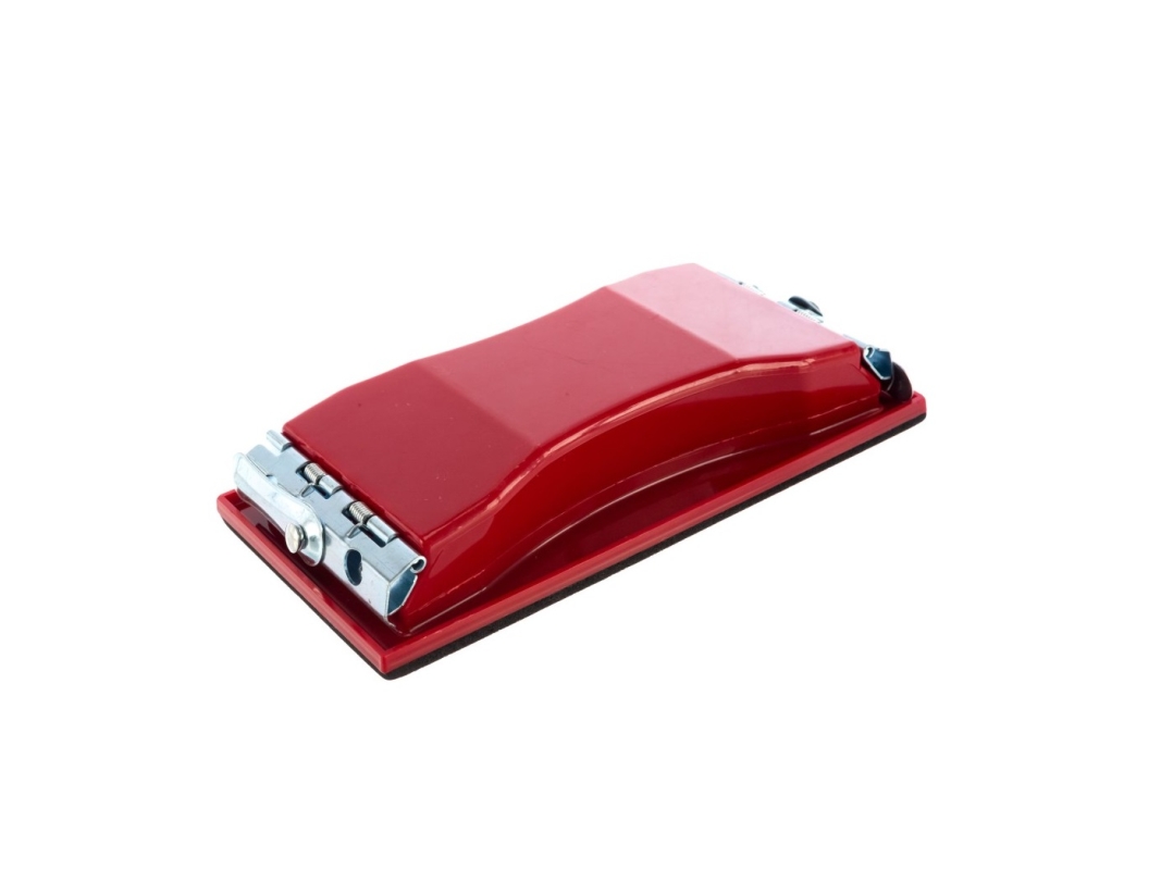 Конструкция изготовлена из пластика. Инструмент оснащен металлическими зажимами, с помощью которых фиксируются сетки и шлифовальные листы.