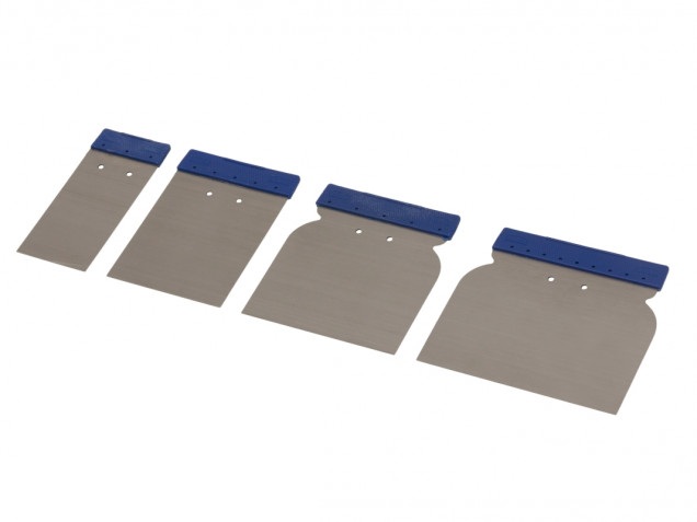 Шпатели металлические имеют мощный прижим, который хорошо удаляет пузырьки воздуха при распределении шпаклевки по основанию, и они также подходят для отделки углов. Рабочая часть шпателей выполнена из нержавеющей стали, а рукоятки из прочного пластика с точками, чтобы предотвратить скольжение.