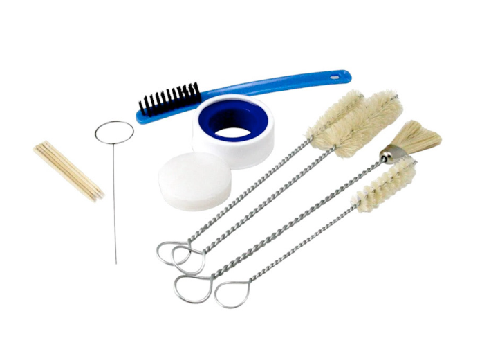 В состав набора входят 13 предметов: ершики (разных размеров) – 3 шт., кисточка – 1 шт., игла – 1 шт., щетка для очистки – 1 шт., тонкая игла – 5 шт., лента PTFE – 1 шт., смазка для краскопультов – 1 шт.