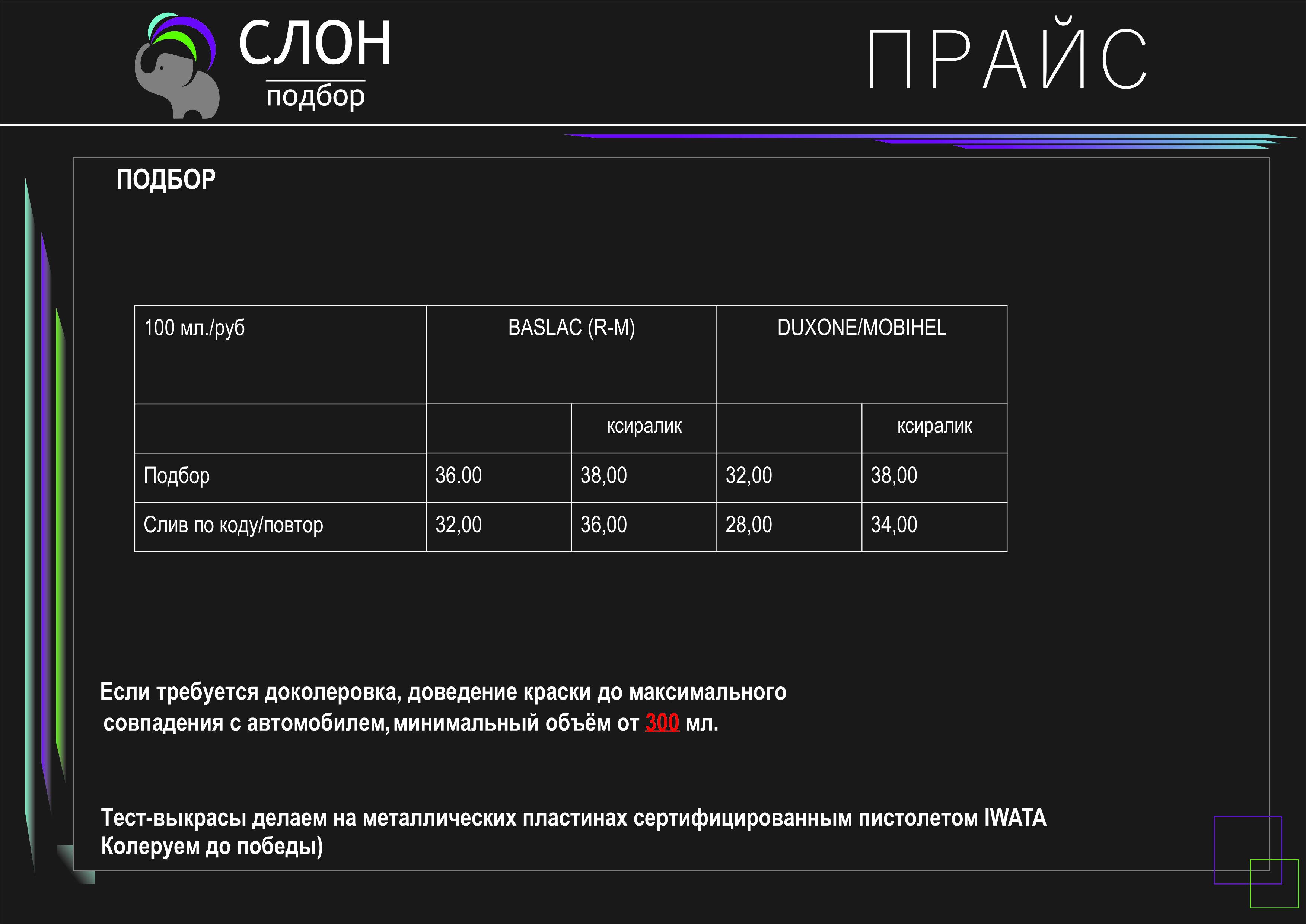 Доверьте точный подбор цвета профессионалам. Закажите компьютерный подбор краски на slonpodbor.by — быстро, удобно, с гарантией совпадения оттенка до 99%. Также в нашем магазине вы можете приобрести автоэмаль и другие товары для вашего автомобиля по выгодным ценам.